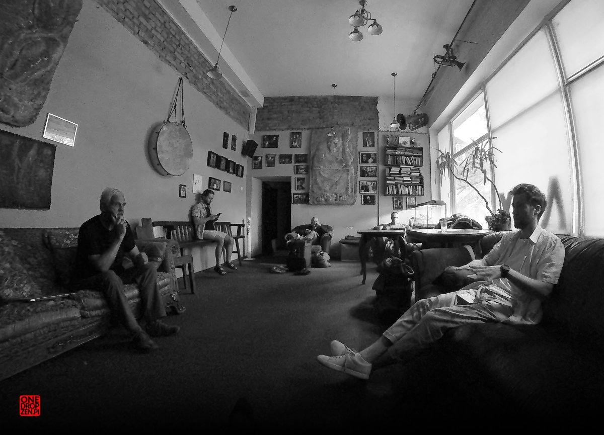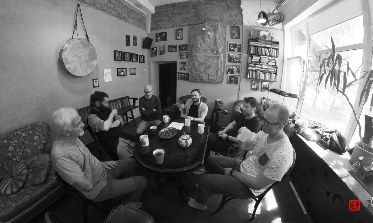 Na zaproszenie do współpracy przy wydarzeniu zareagowali na szczęście „oldtimerzy” – Kurth Shinkai Hoelting i Dokyo Larry Zgolin – ludzie, których życie dawno przestało być związane z formalną strukturą klasztorów. Usłyszeli w tym zaproszeniu coś, co było dla nich prawdziwe. Nie wahali się podjąć wyzwania. Tak samo Dobiesław Kakushin Pałeczka, który dołączył w ostatniej chwili, poznany przeze mnie ledwie trzy dni przed wyjazdem do Kijowa, podczas sesshin z mistrzem zen Shodo Haradą w Paprotnie. A potem dołączyli ci, którzy żyli tym konfliktem na co dzień: rzeźbiarz, artysta Vasily Grynevich, muzyk, nauczyciel mindfulness Valta Pashkovski, twórca teatralny, animator Andrii Palatyn oraz Sashko z ekipy teatru Dakh. Każdy z nich wnosił w te działanie coś więcej niż tylko swoją obecność – wnosił swoje życie, swoje doświadczenie, zaufanie i swoją gotowość, by przez 7 pełnych dni zamknąć się na ciemnej scenie teatru by usiąść w ciszy pośród wojny i podzielić się tym aktem z przez lifestreaming na Facebok oraz Youtube z resztą świata.