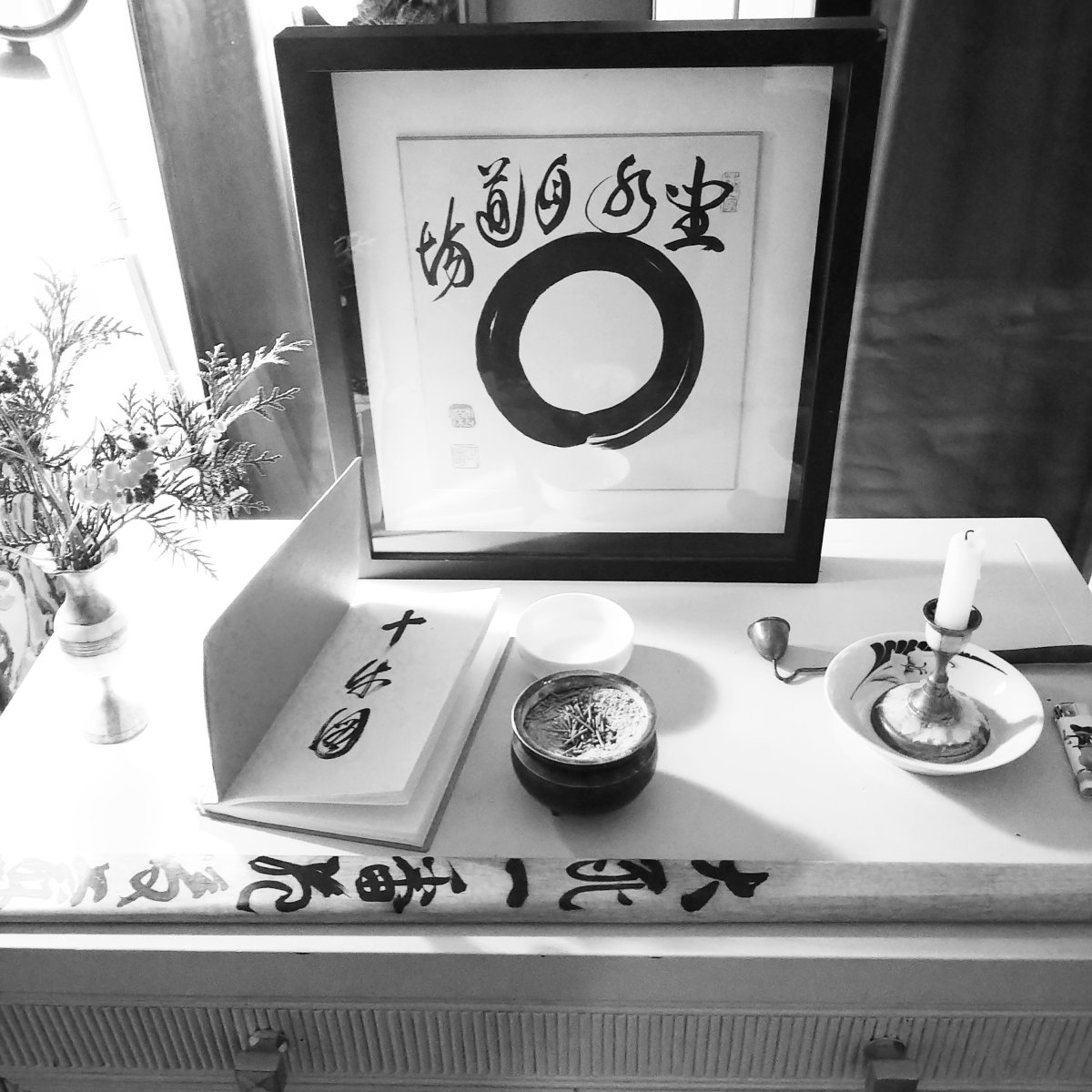 Ołtarz odosobnienia urządzony był w minimalnej formie, jego głównym elementem była pierwsza kaligrafia otrzymana przeze mnie od Roshiego, przedstawiająca Enso, oraz wers Za Sui Getsu Dojo czyli "Siedzieć w Dojo Księżyca Wody". Eihei Dogen, japoński założyciel tradycji Soto, pięknie wyraził to w Genjokoan: Oświecenie jest jak księżyc odbijający się w wodzie. Księżyc nie nasiąka wodą, ani woda się nie jest przez księżyc rozbita. Chociaż jego światło jest szerokie i wielkie, księżyc odbija się nawet w kałuży szerokiej na cal. Cały księżyc i całe niebo odbijają się w kroplach rosy na trawie, a nawet w jednej kropli wody. Oświecenie was nie narusza, tak jak księżyc nie narusza wody. Nie możesz zatrzymać oświecenia, tak jak kropla wody nie zatrzymuje księżyca na niebie.